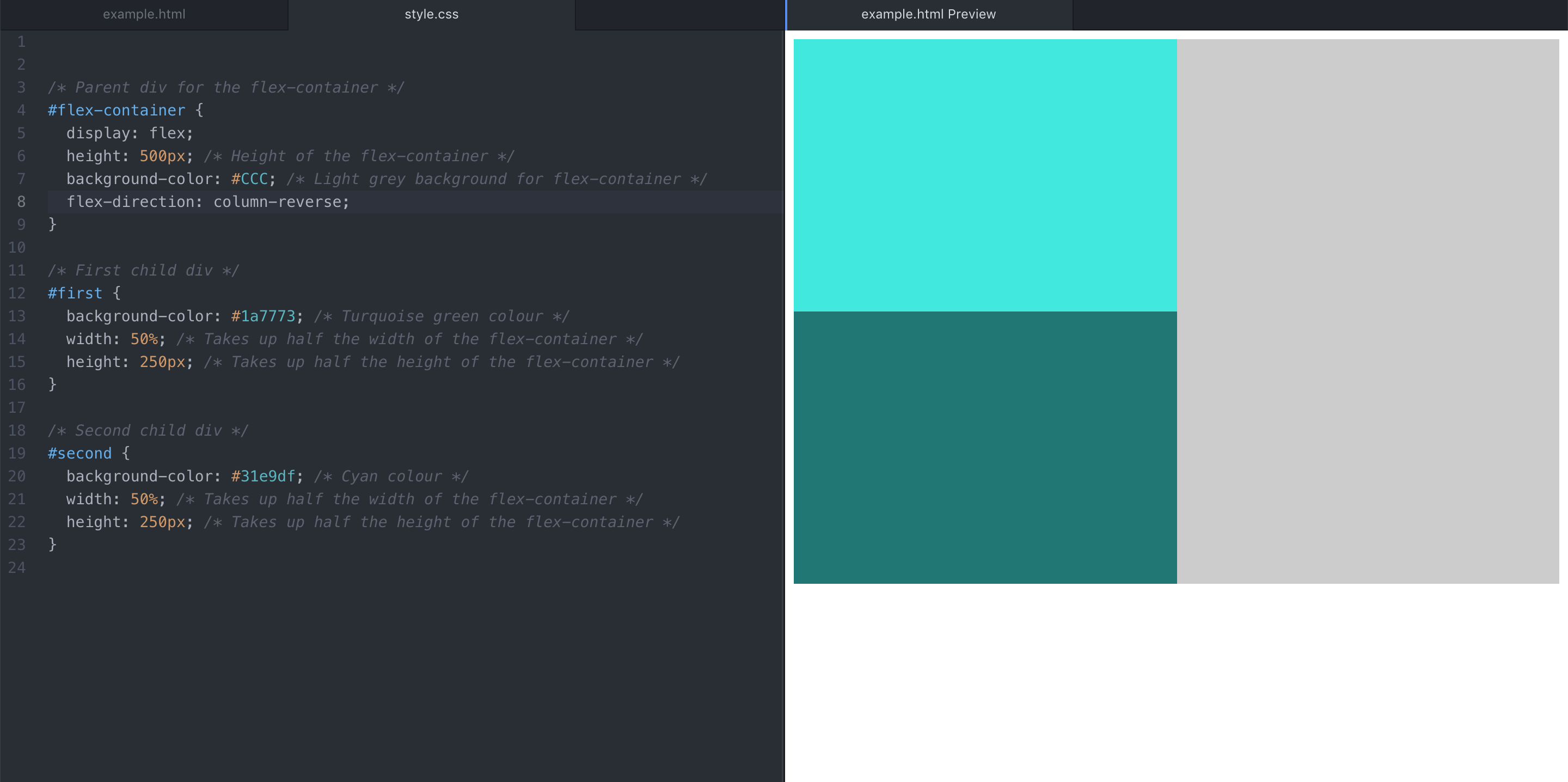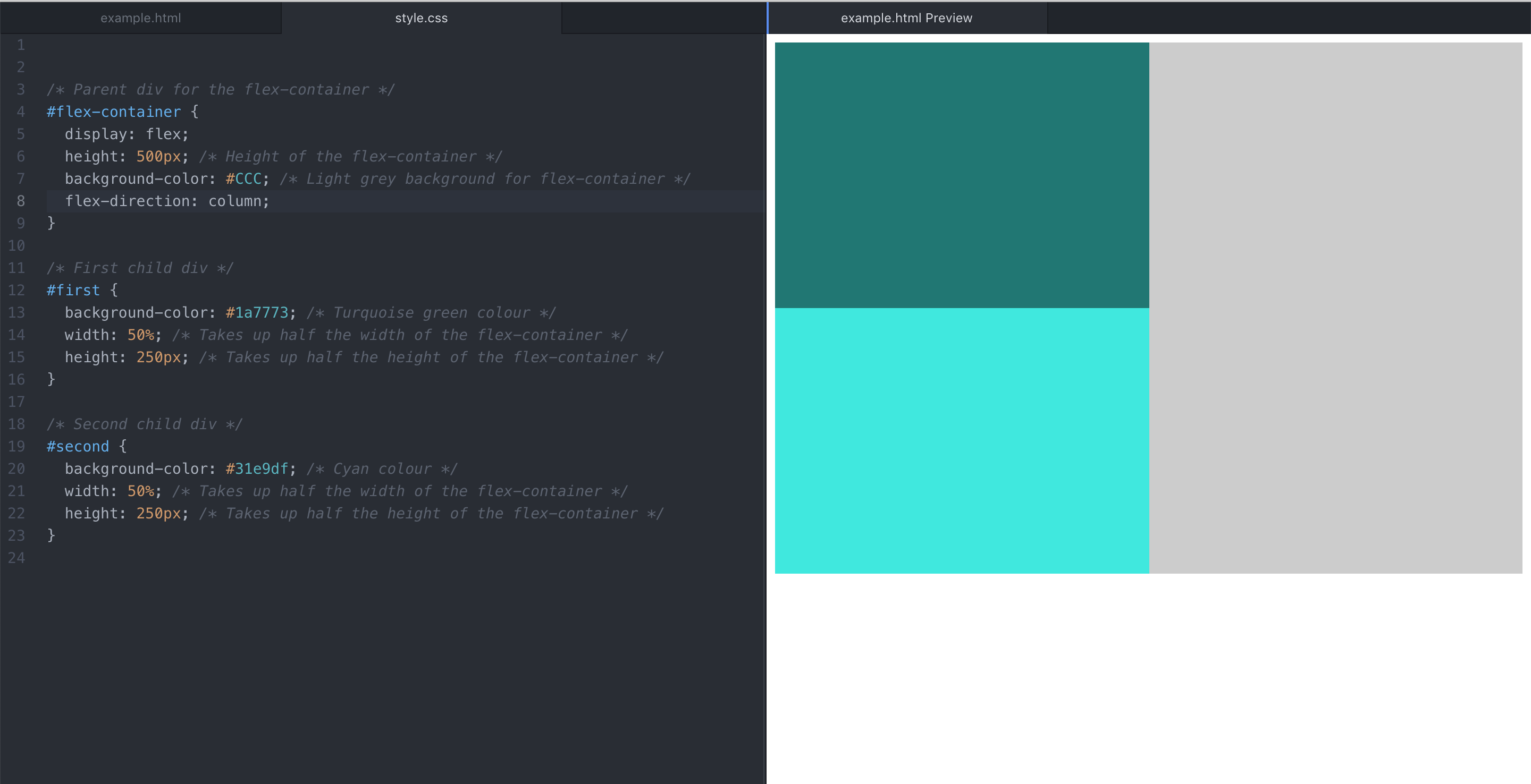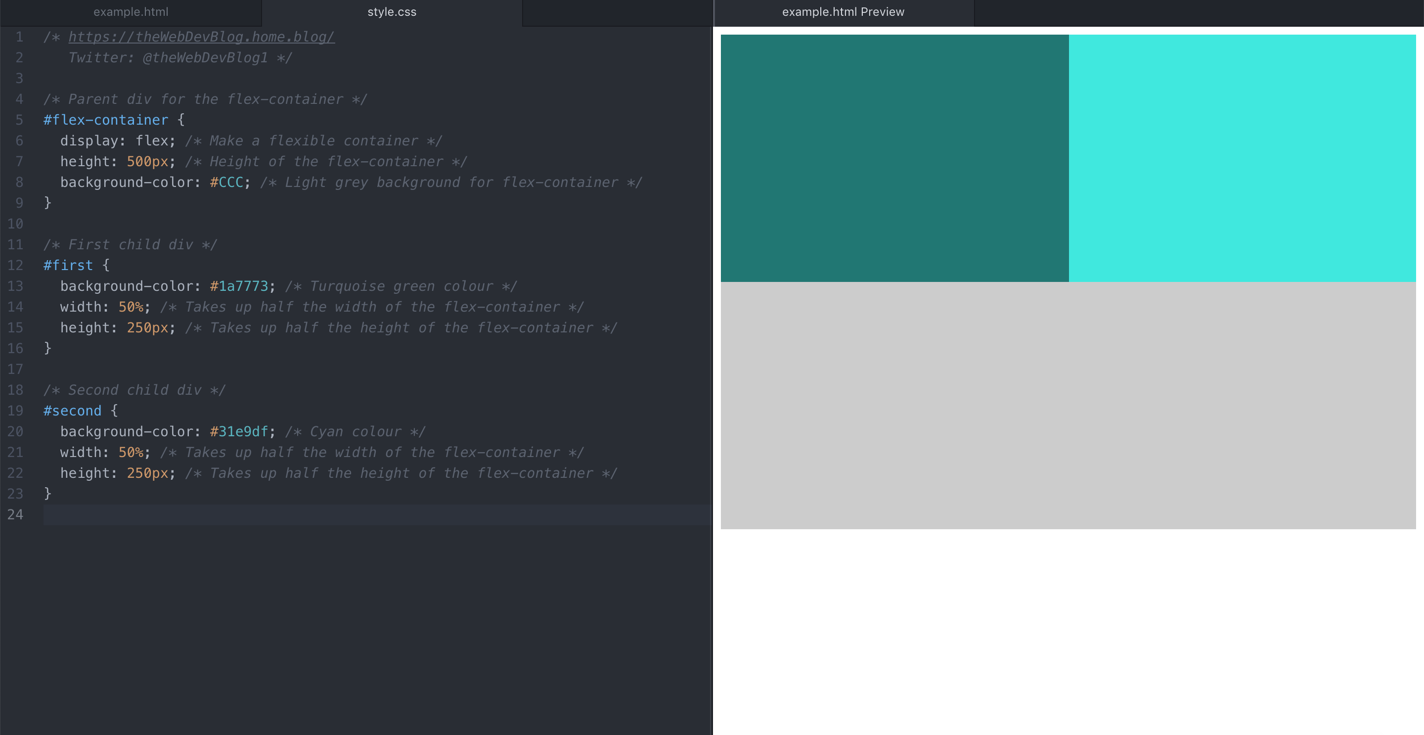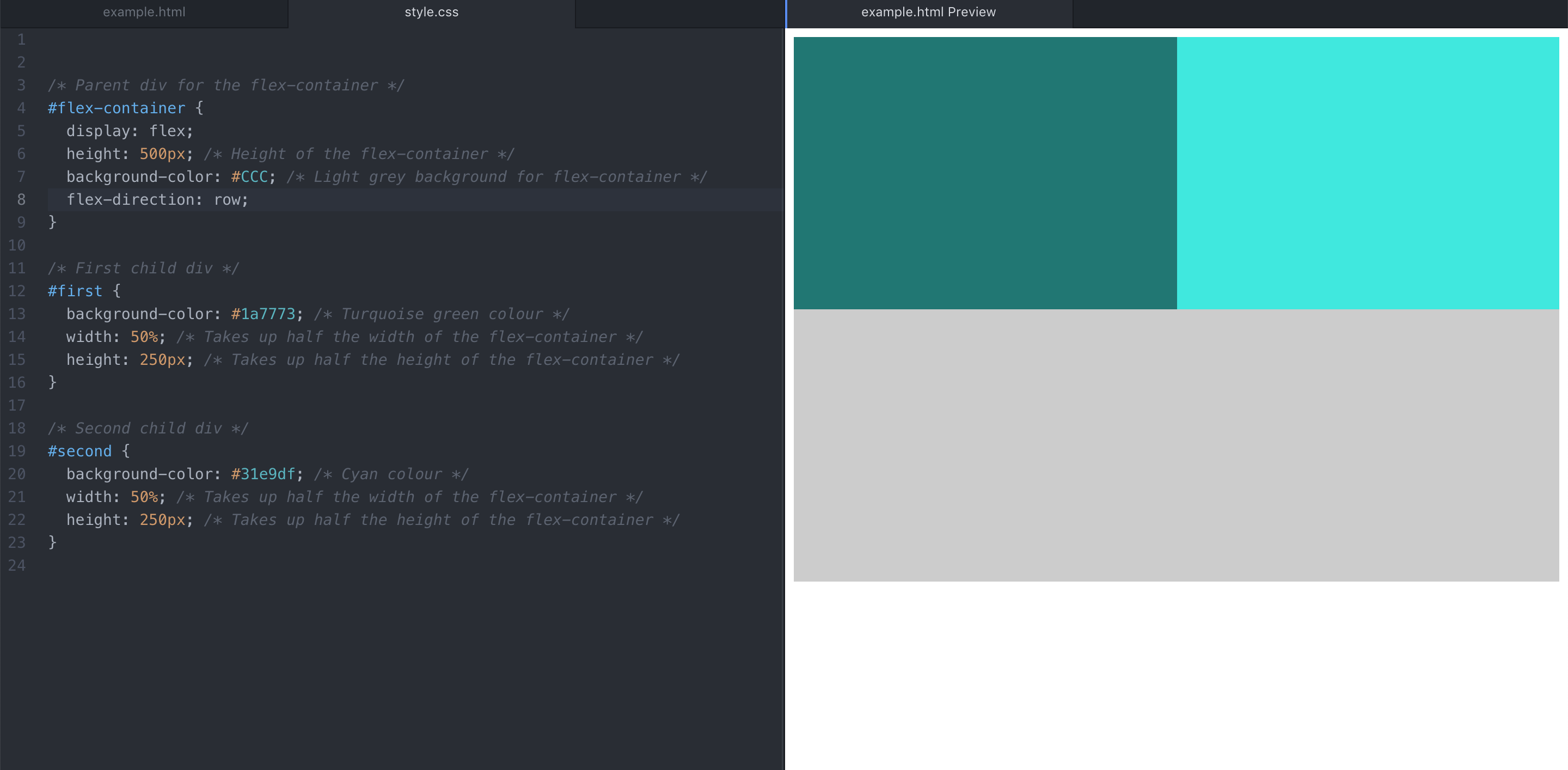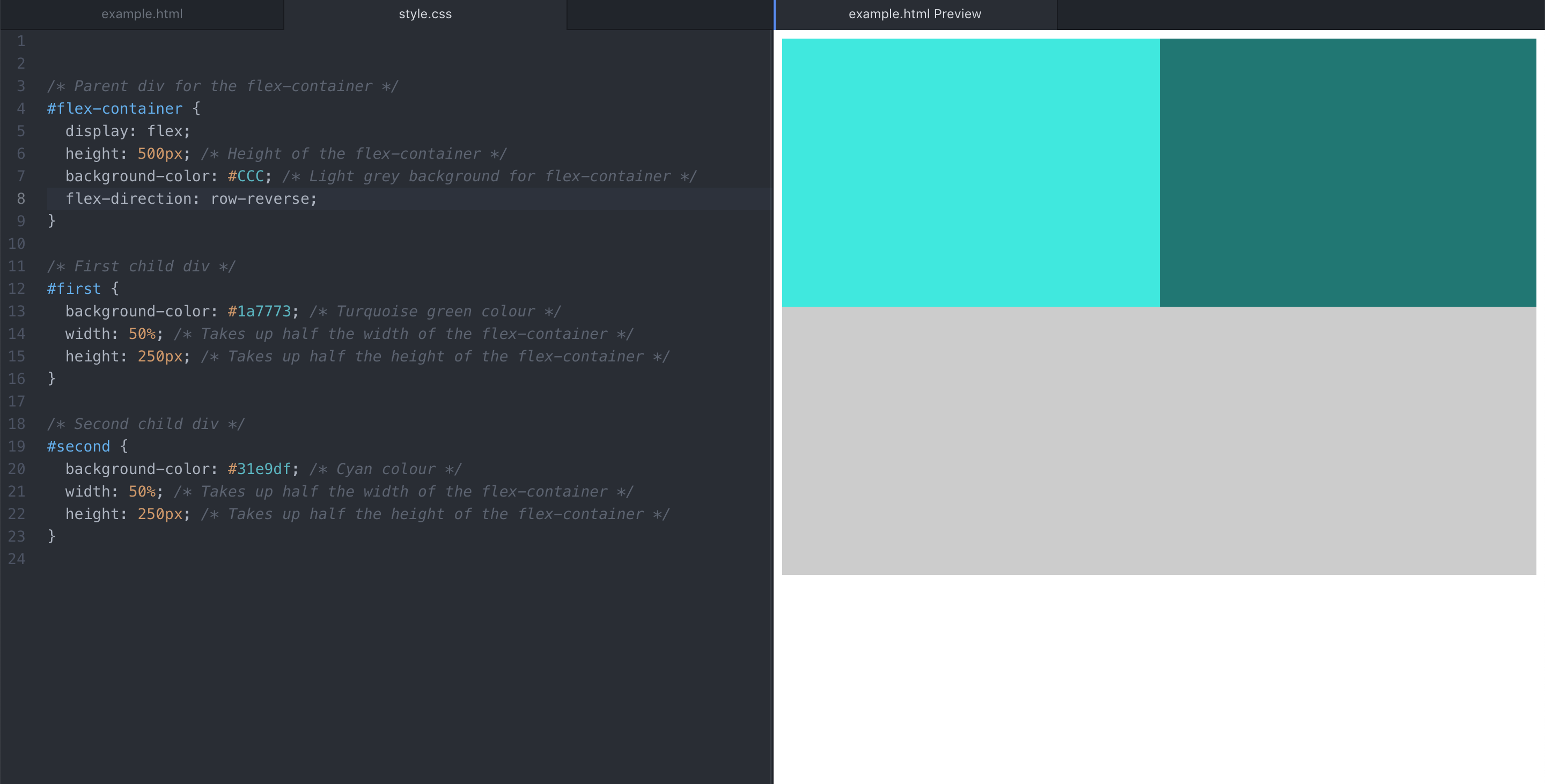 This shows the CSS used to help explain how the flexbox works. Here, the styling is applied to the id of flex-container which, as shown above, was the id to the parent div. The flex-container (flexible container) is created with the display: flex; as shown below. The container is given a height: 500px; and the background of the flex-container is set to a background-color: #CCC; which is a light grey as can be seen in the preview on the right.