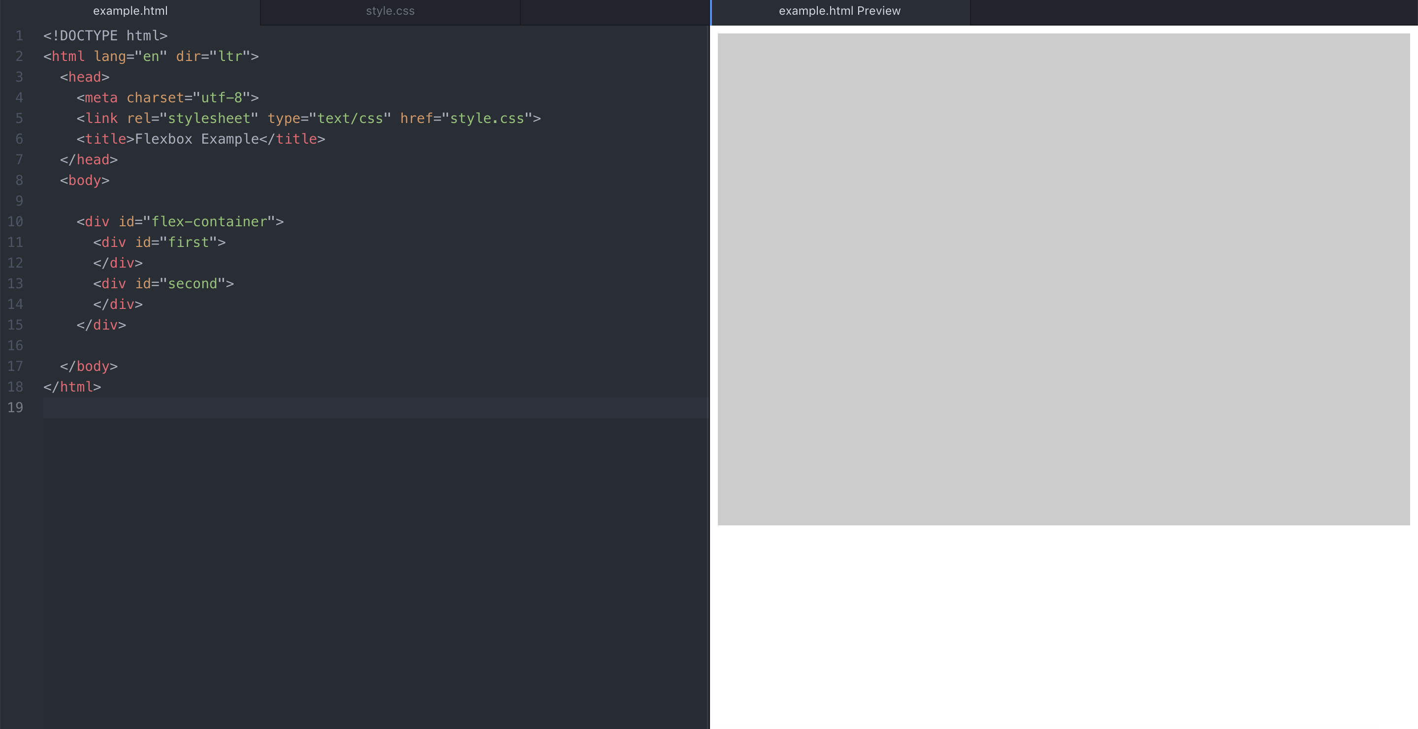 This shows the HTML used to help explain how the flexbox works. Here, the flexbox is within a flex-box container. This will be shown in the CSS which will be applied to the id of flex-container. The parent div is given the id of flex-container. Inside of this flex-container are two further div tags, one of which has an id of first and the second an id of second. These will be used to create two boxes within the flex-container to show how flexbox can be used.